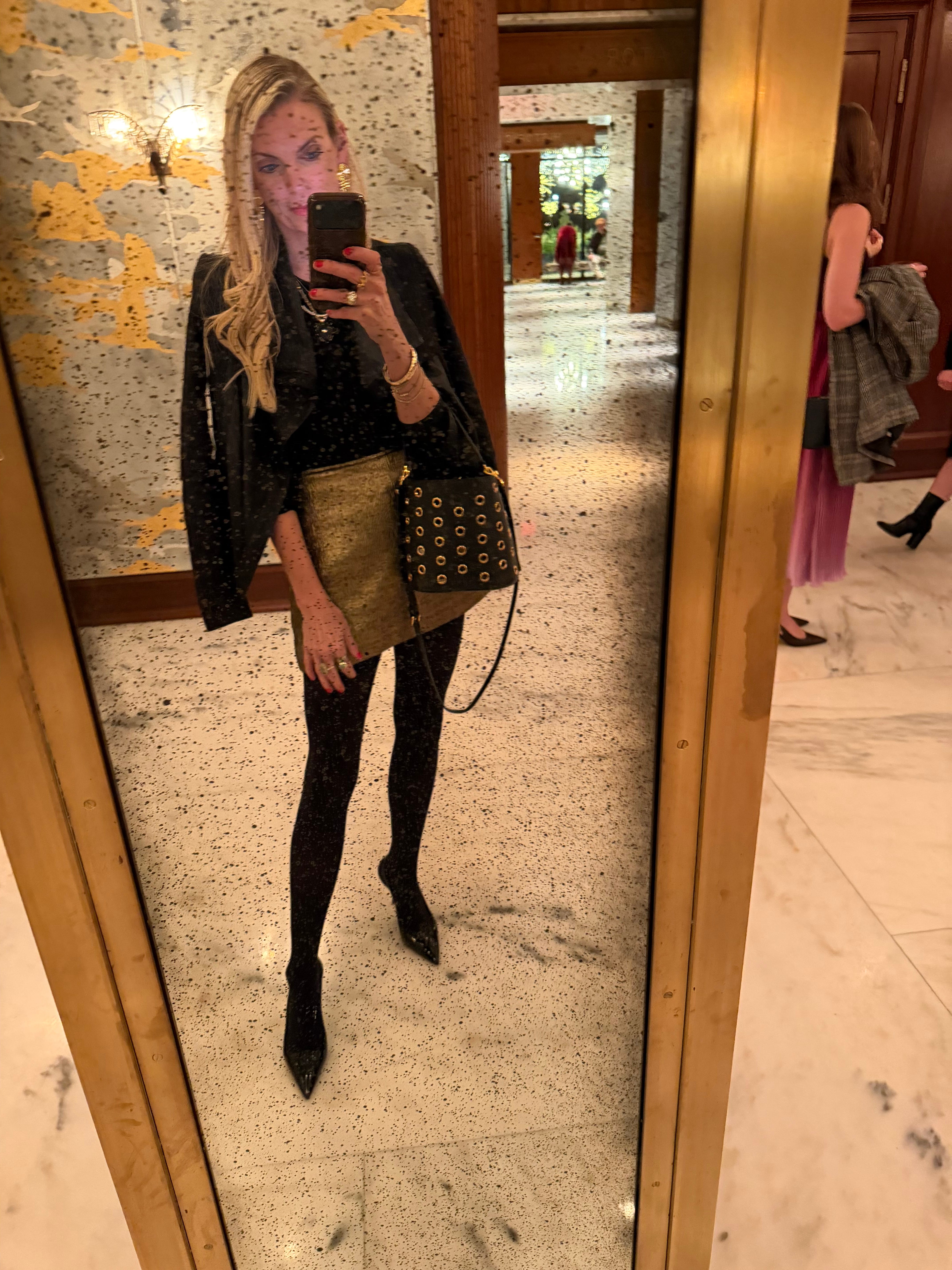 Holiday Look 1|. I love this metallic gold mini. It has a matching top too.