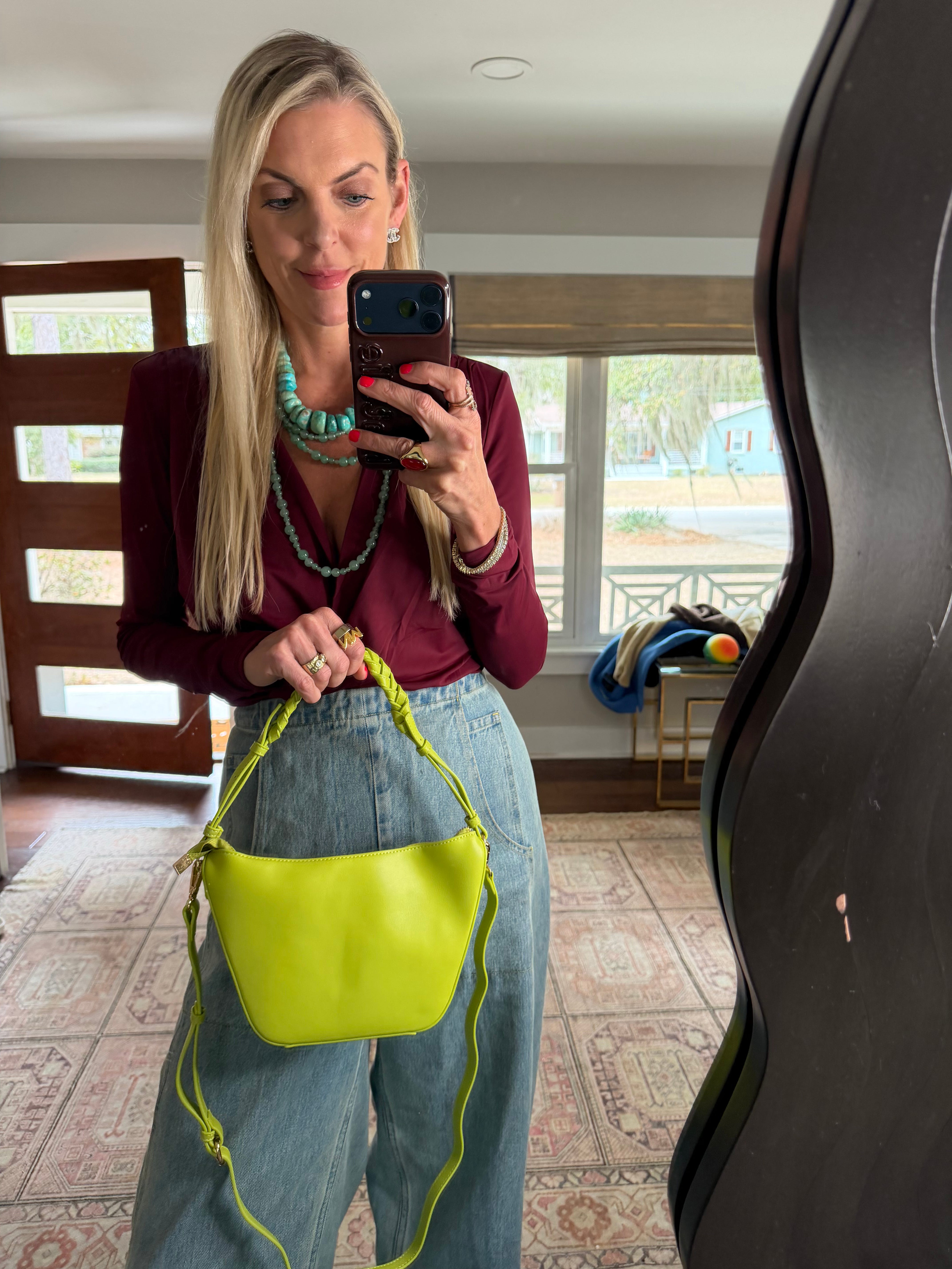 Chartreuse Purse | I love the pop of color this purse brings. Added bonus it is a great price point right at $100. I like that you can carry it with a handle strap or attach a longer one to wear as a crossbody or shoulder purse.